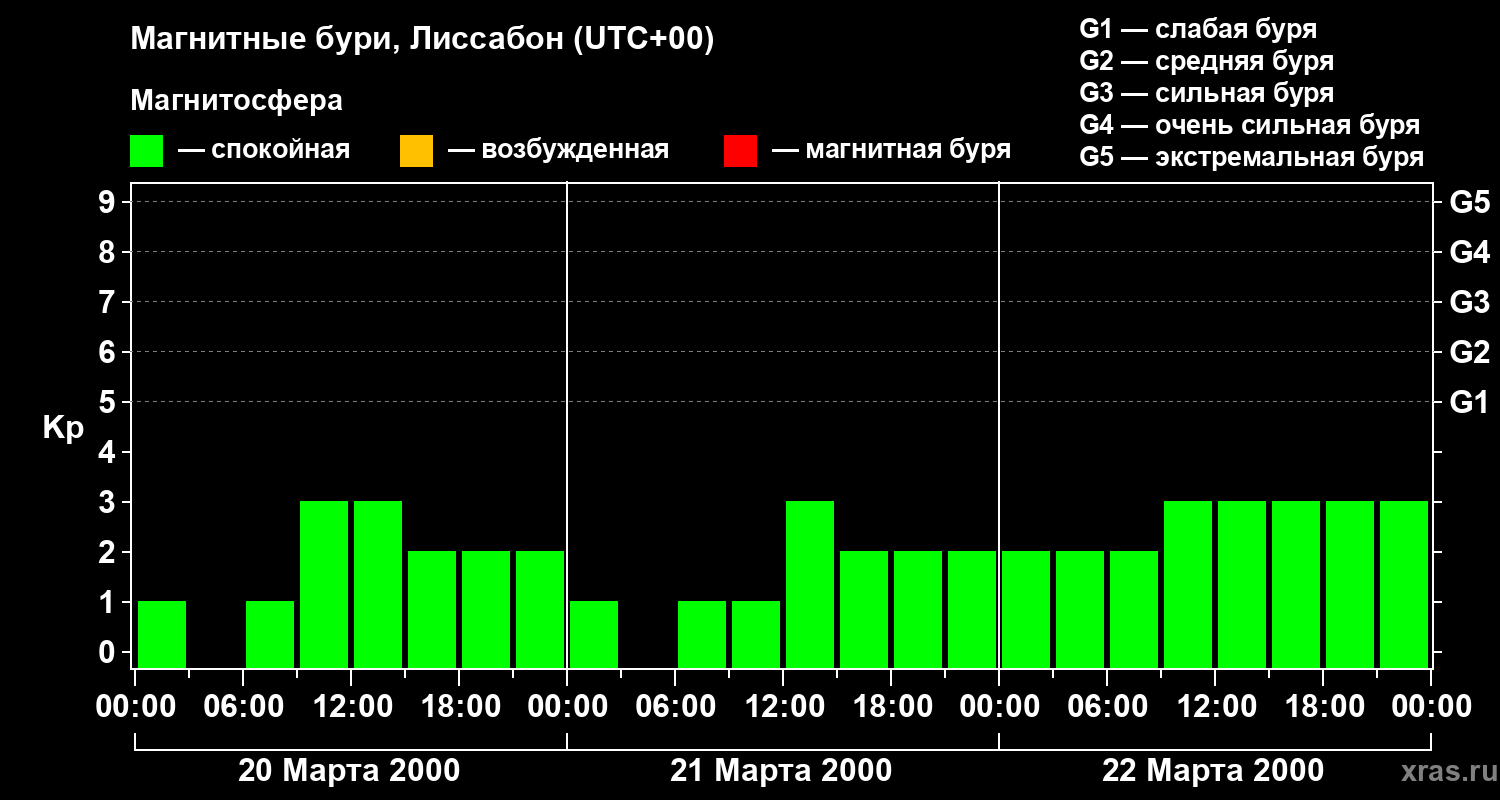 Изменения геомагнитного индекса Kp с 20 по 22 марта 2000 года для средних широт