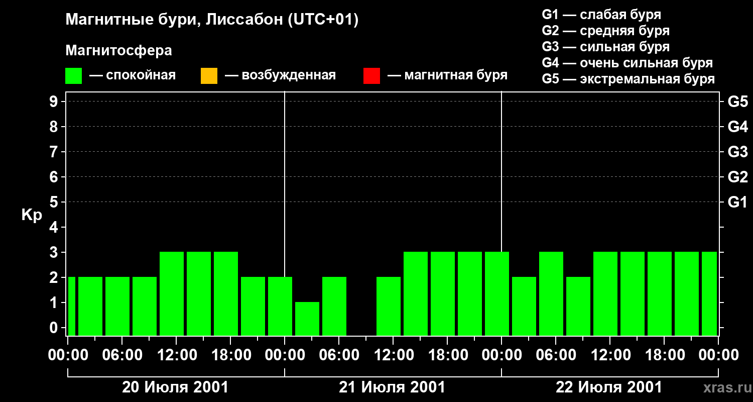Изменения геомагнитного индекса Kp с 20 по 22 июля 2001 года для средних широт