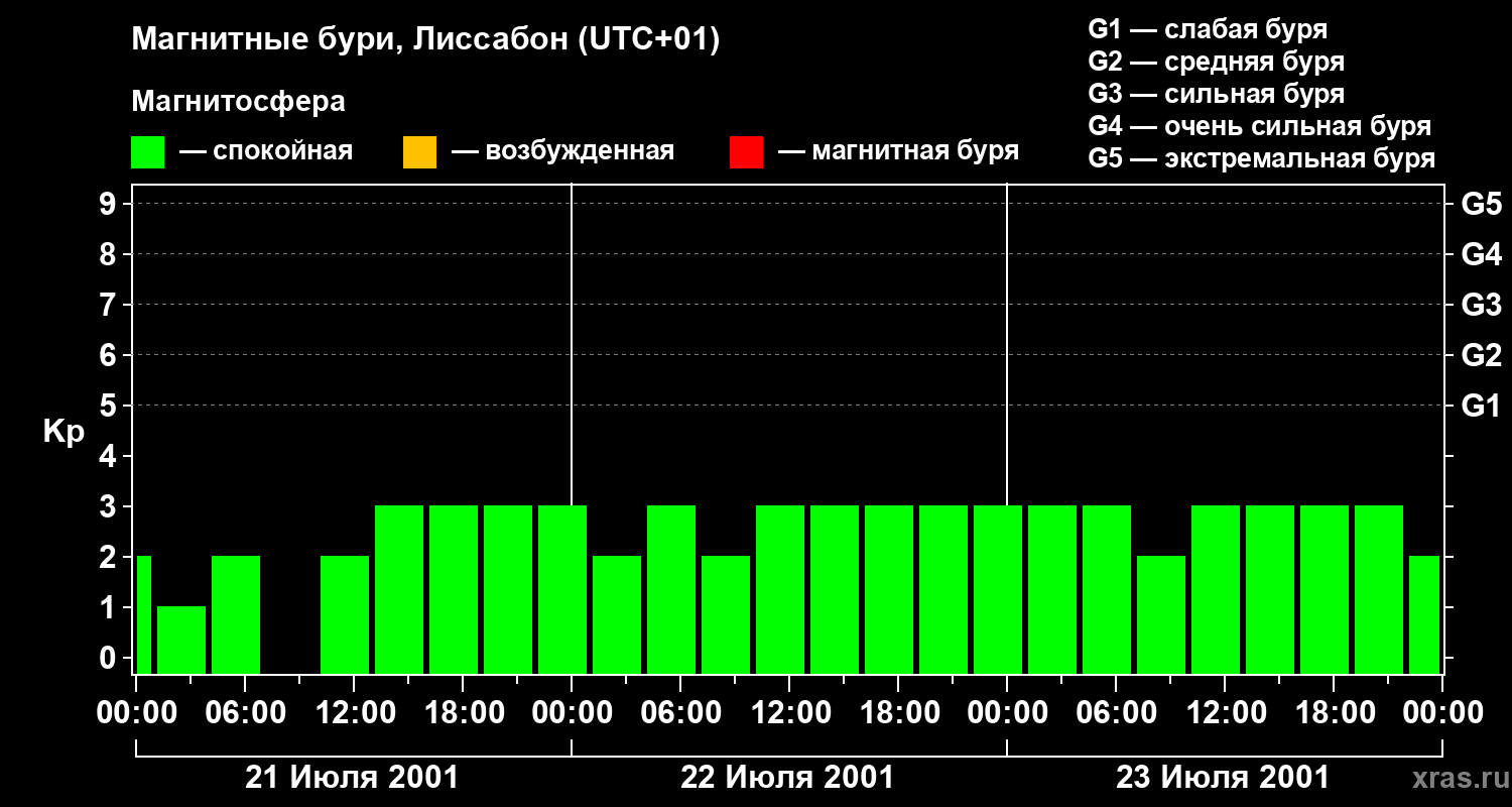 Изменения геомагнитного индекса Kp с 21 по 23 июля 2001 года для средних широт