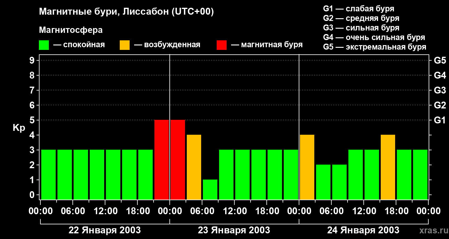 Изменения геомагнитного индекса Kp с 22 по 24 января 2003 года для средних широт