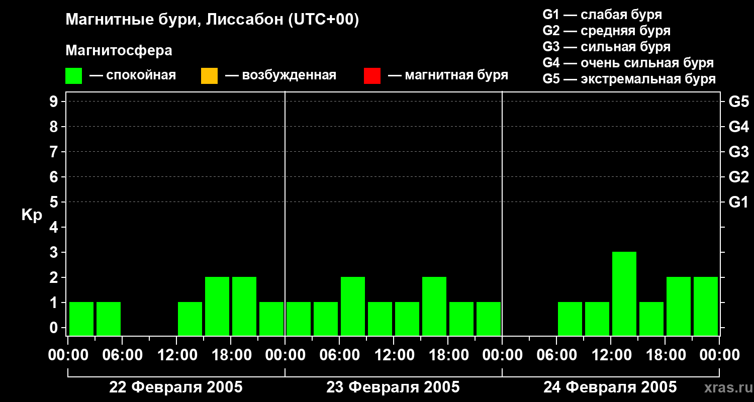 Изменения геомагнитного индекса Kp с 22 по 24 февраля 2005 года для средних широт