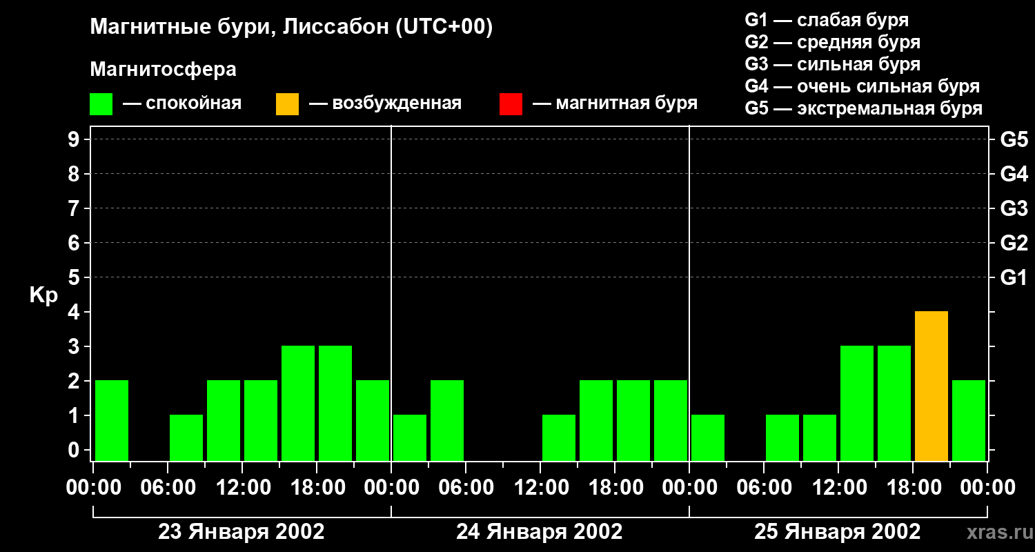 Изменения геомагнитного индекса Kp с 23 по 25 января 2002 года для средних широт