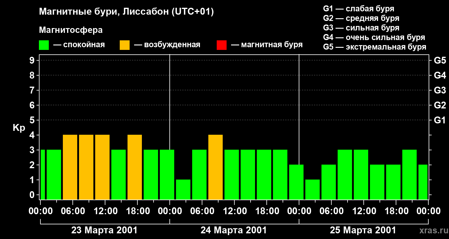 Изменения геомагнитного индекса Kp с 23 по 25 марта 2001 года для средних широт
