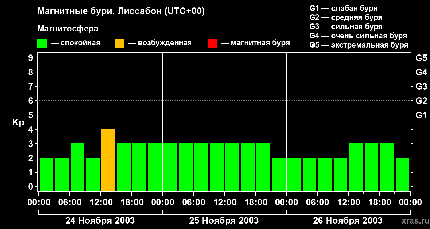 Изменения геомагнитного индекса Kp с 24 по 26 ноября 2003 года для средних широт
