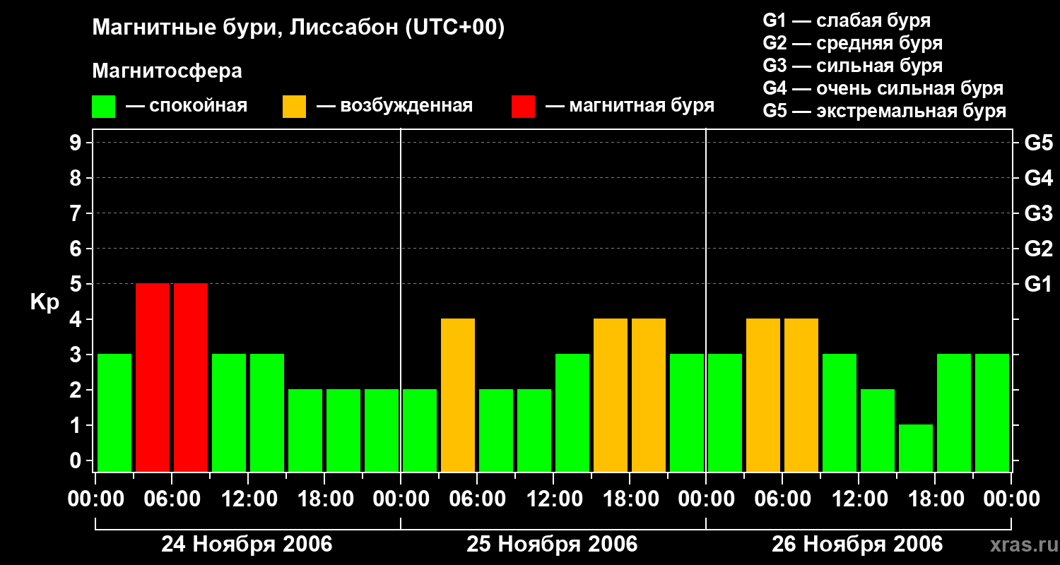 Изменения геомагнитного индекса Kp с 24 по 26 ноября 2006 года для средних широт