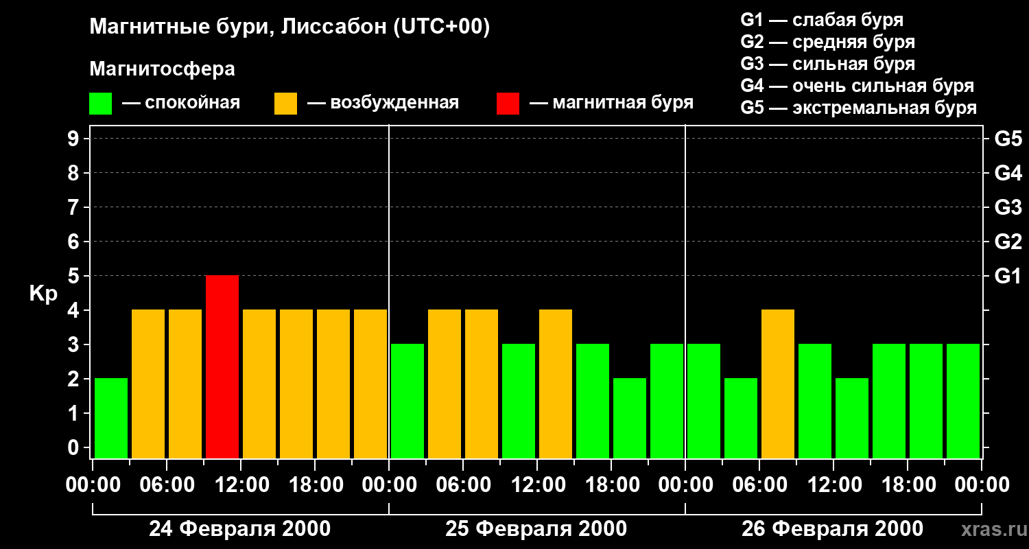 Изменения геомагнитного индекса Kp с 24 по 26 февраля 2000 года для средних широт