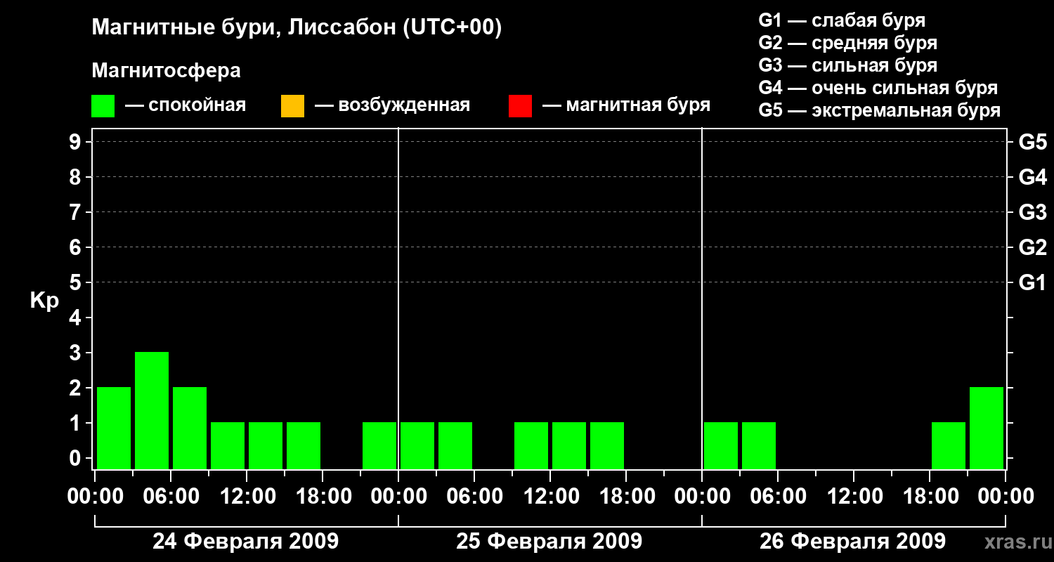 Изменения геомагнитного индекса Kp с 24 по 26 февраля 2009 года для средних широт