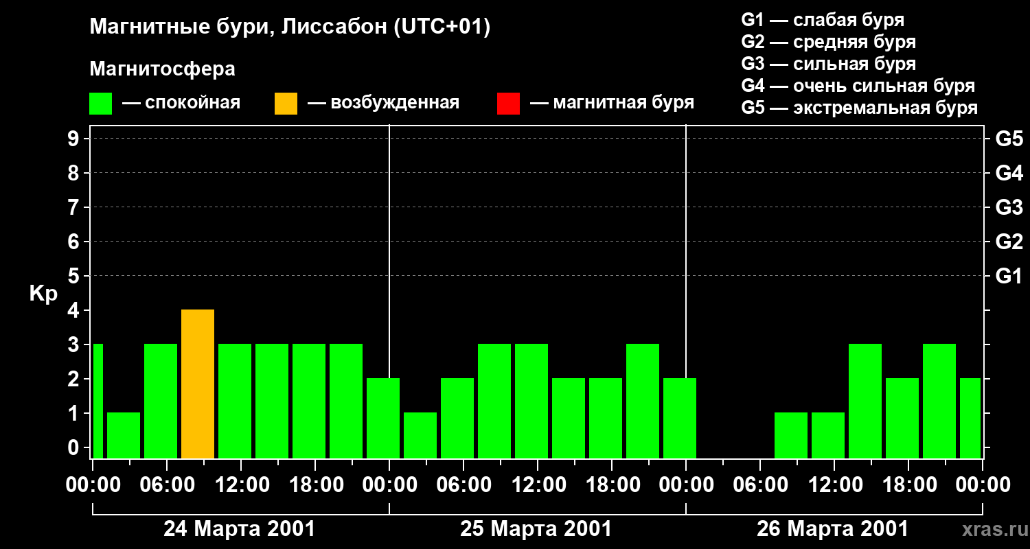 Изменения геомагнитного индекса Kp с 24 по 26 марта 2001 года для средних широт