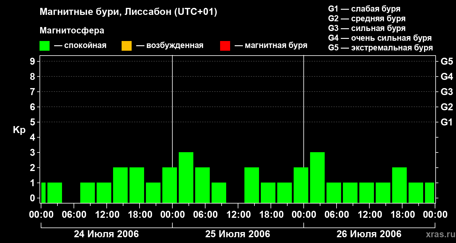 Изменения геомагнитного индекса Kp с 24 по 26 июля 2006 года для средних широт
