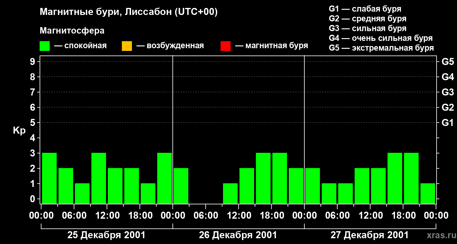 Изменения геомагнитного индекса Kp с 25 по 27 декабря 2001 года для средних широт