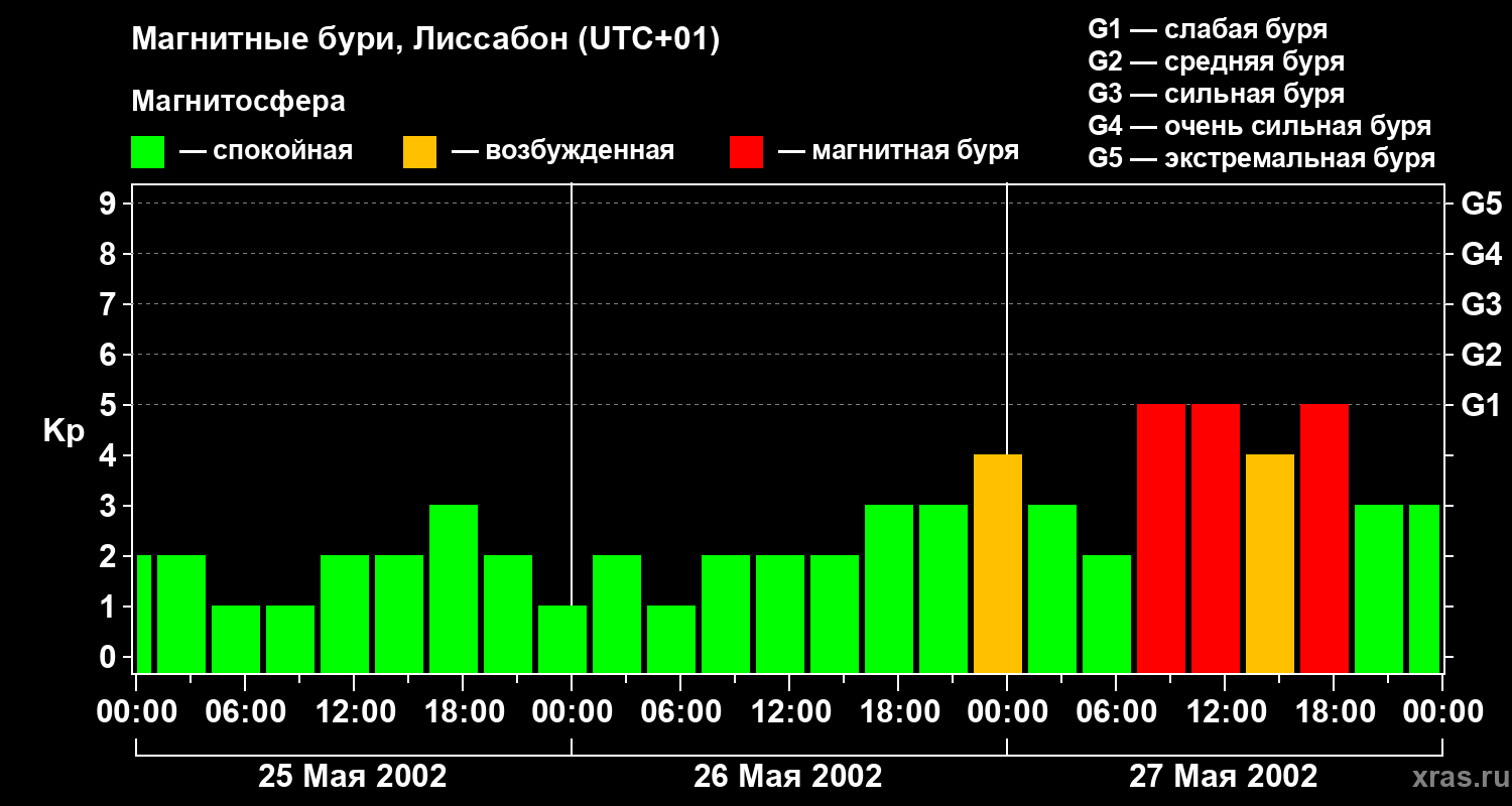 Изменения геомагнитного индекса Kp с 25 по 27 мая 2002 года для средних широт