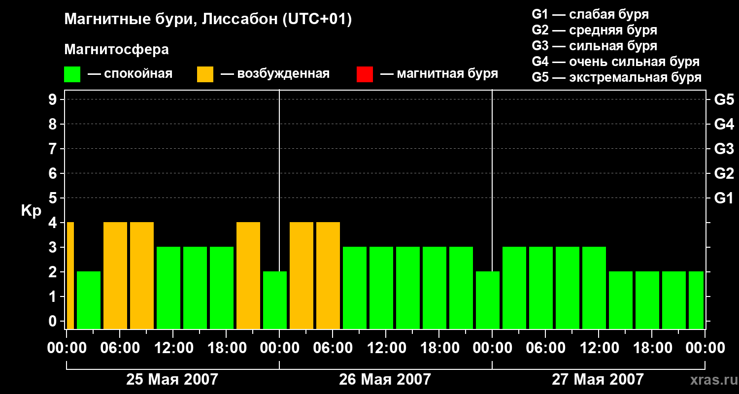 Изменения геомагнитного индекса Kp с 25 по 27 мая 2007 года для средних широт