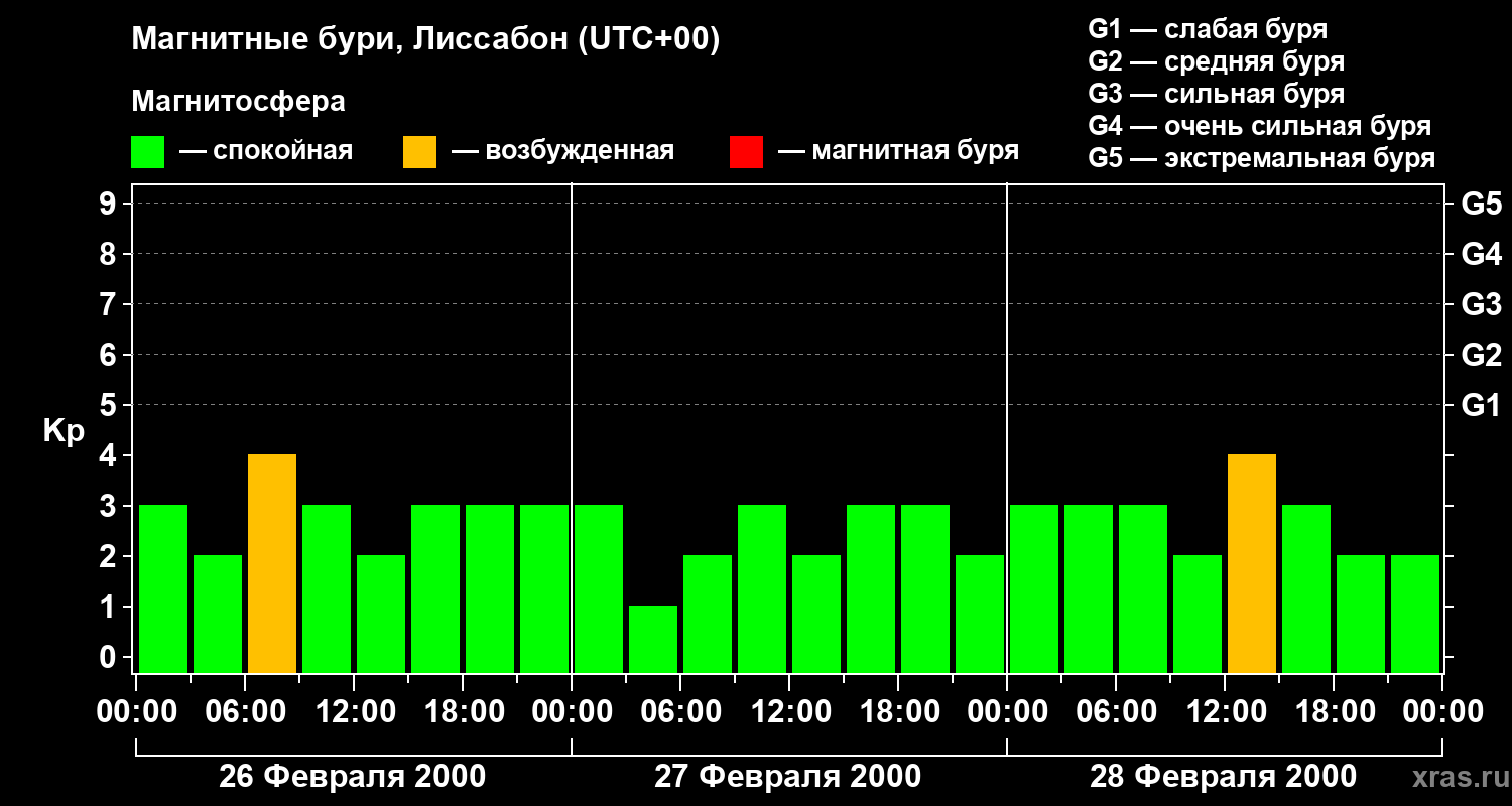 Изменения геомагнитного индекса Kp с 26 по 28 февраля 2000 года для средних широт