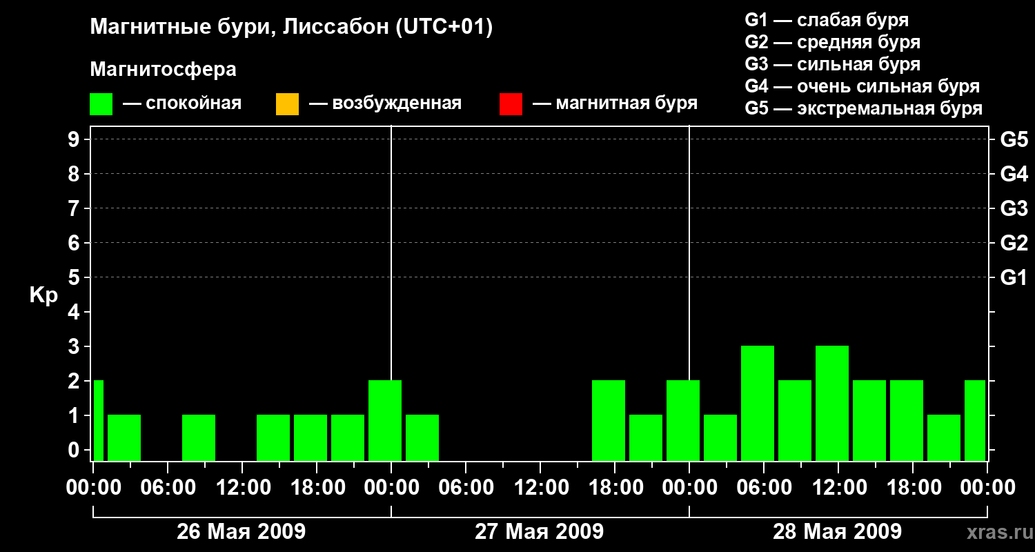 Изменения геомагнитного индекса Kp с 26 по 28 мая 2009 года для средних широт