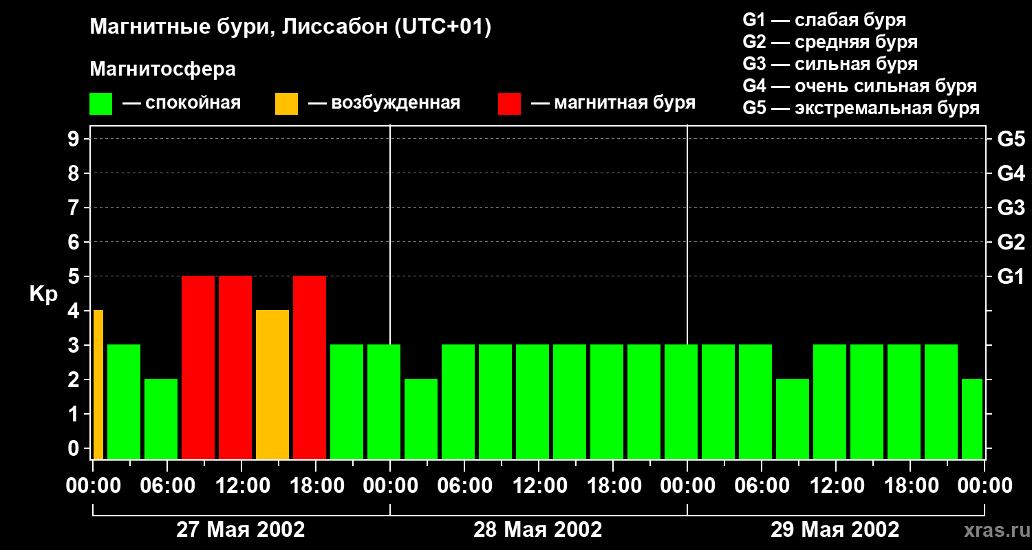 Изменения геомагнитного индекса Kp с 27 по 29 мая 2002 года для средних широт