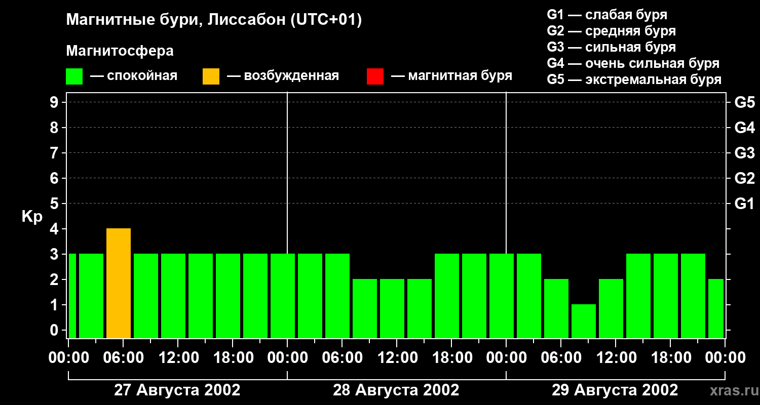 Изменения геомагнитного индекса Kp с 27 по 29 августа 2002 года для средних широт