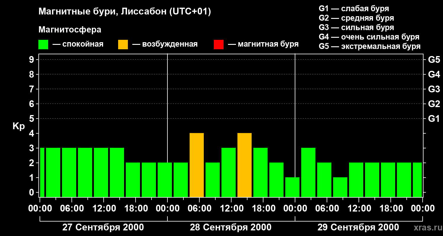 Изменения геомагнитного индекса Kp с 27 по 29 сентября 2000 года для средних широт
