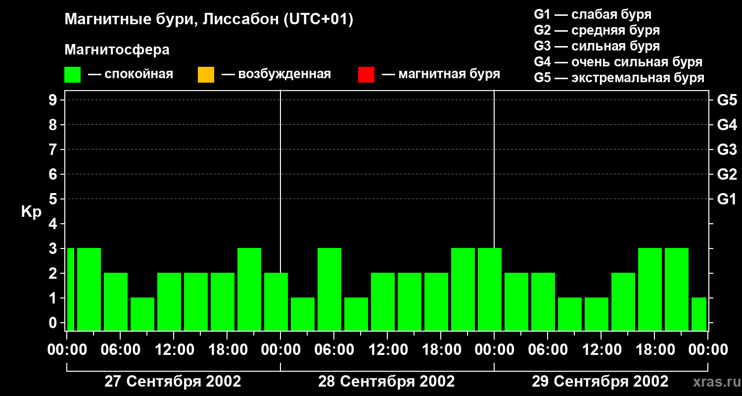 Изменения геомагнитного индекса Kp с 27 по 29 сентября 2002 года для средних широт