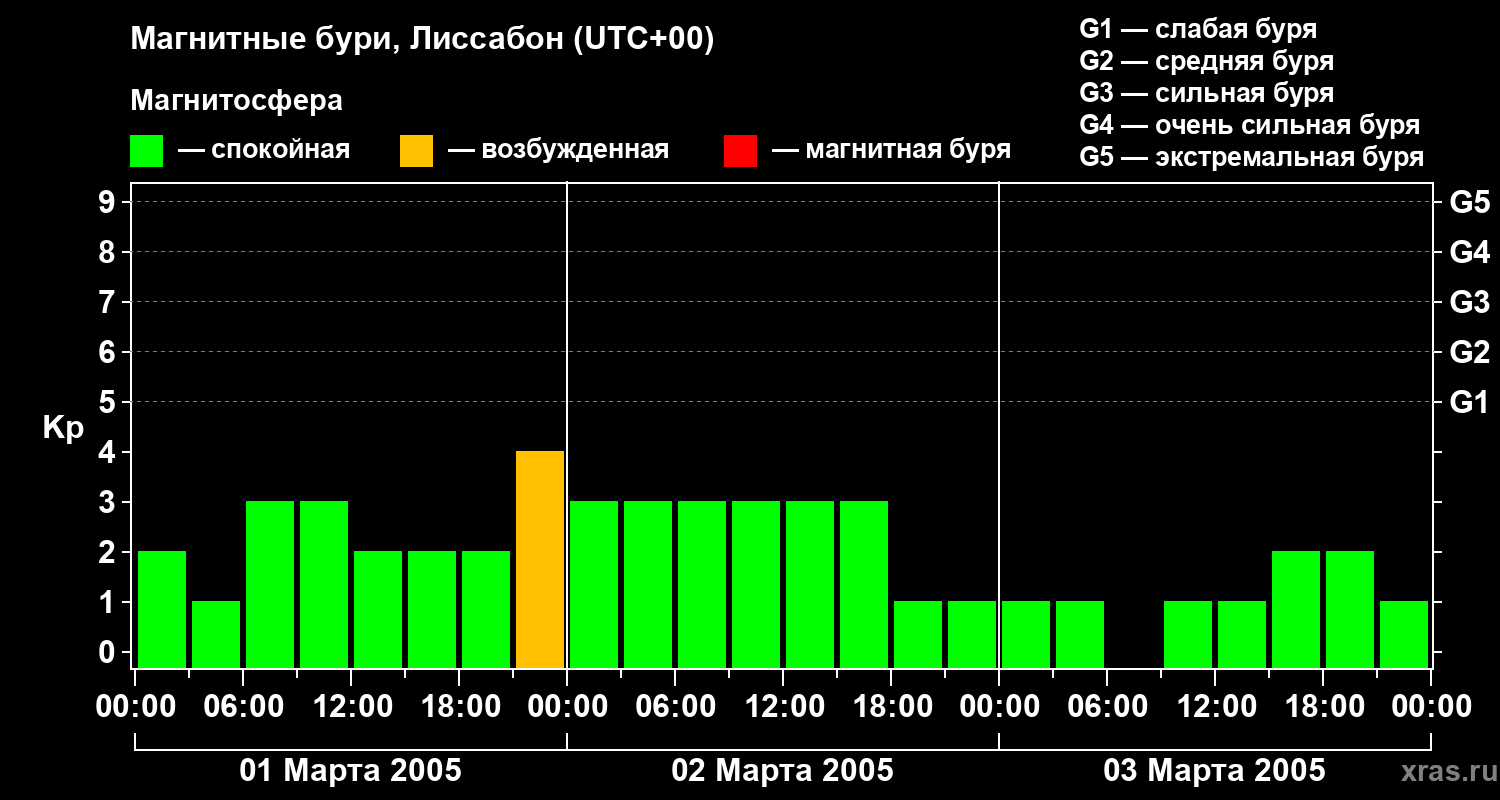 Изменения геомагнитного индекса Kp с 1 по 3 марта 2005 года для средних широт