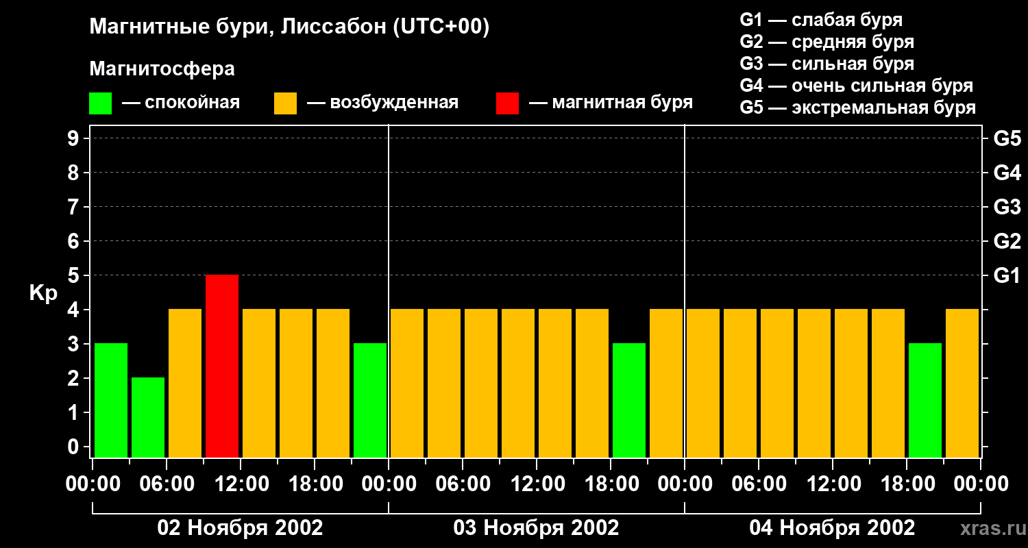 Изменения геомагнитного индекса Kp с 2 по 4 ноября 2002 года для средних широт