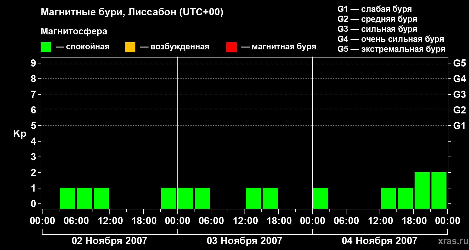 Изменения геомагнитного индекса Kp с 2 по 4 ноября 2007 года для средних широт