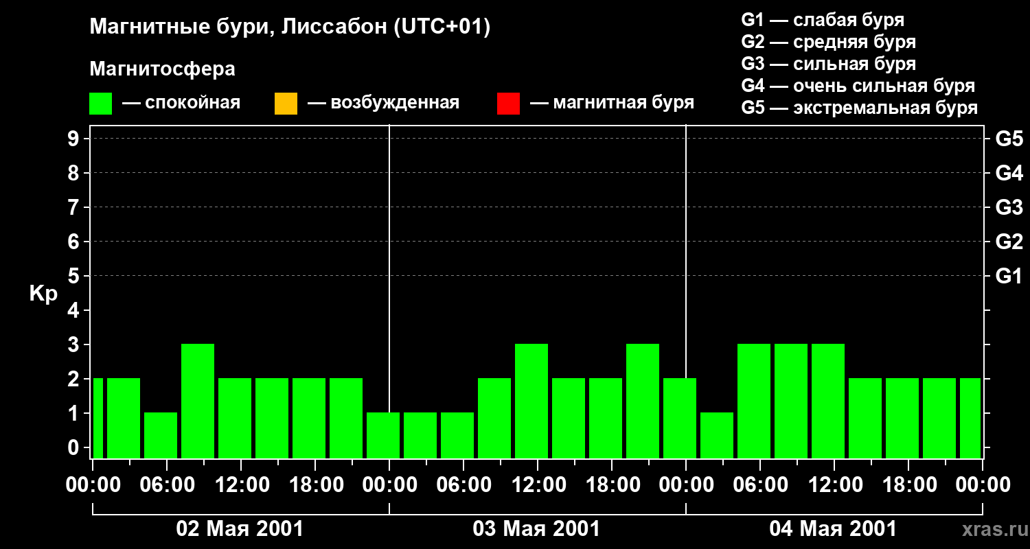 Изменения геомагнитного индекса Kp с 2 по 4 мая 2001 года для средних широт