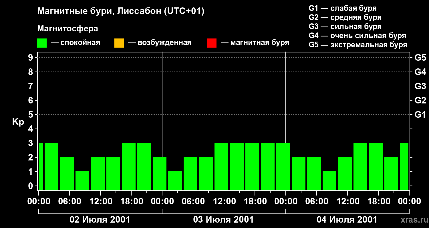 Изменения геомагнитного индекса Kp с 2 по 4 июля 2001 года для средних широт