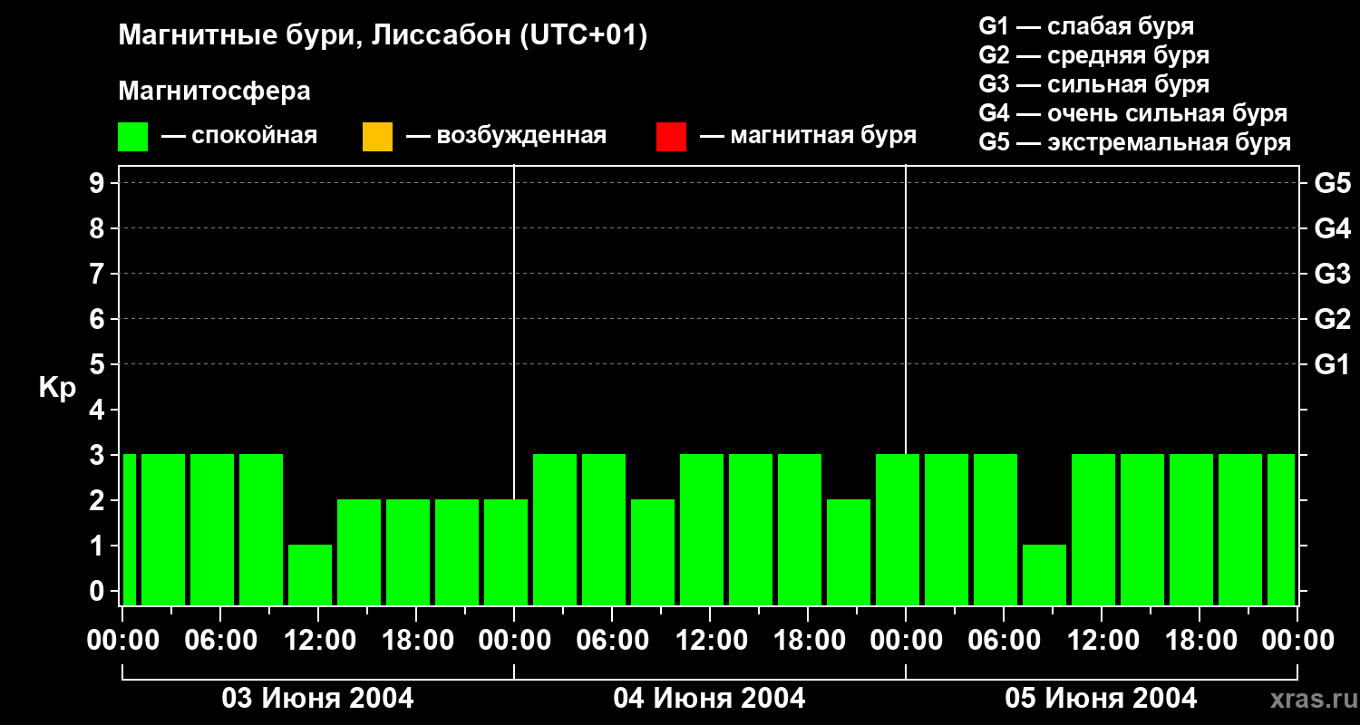 Изменения геомагнитного индекса Kp с 3 по 5 июня 2004 года для средних широт