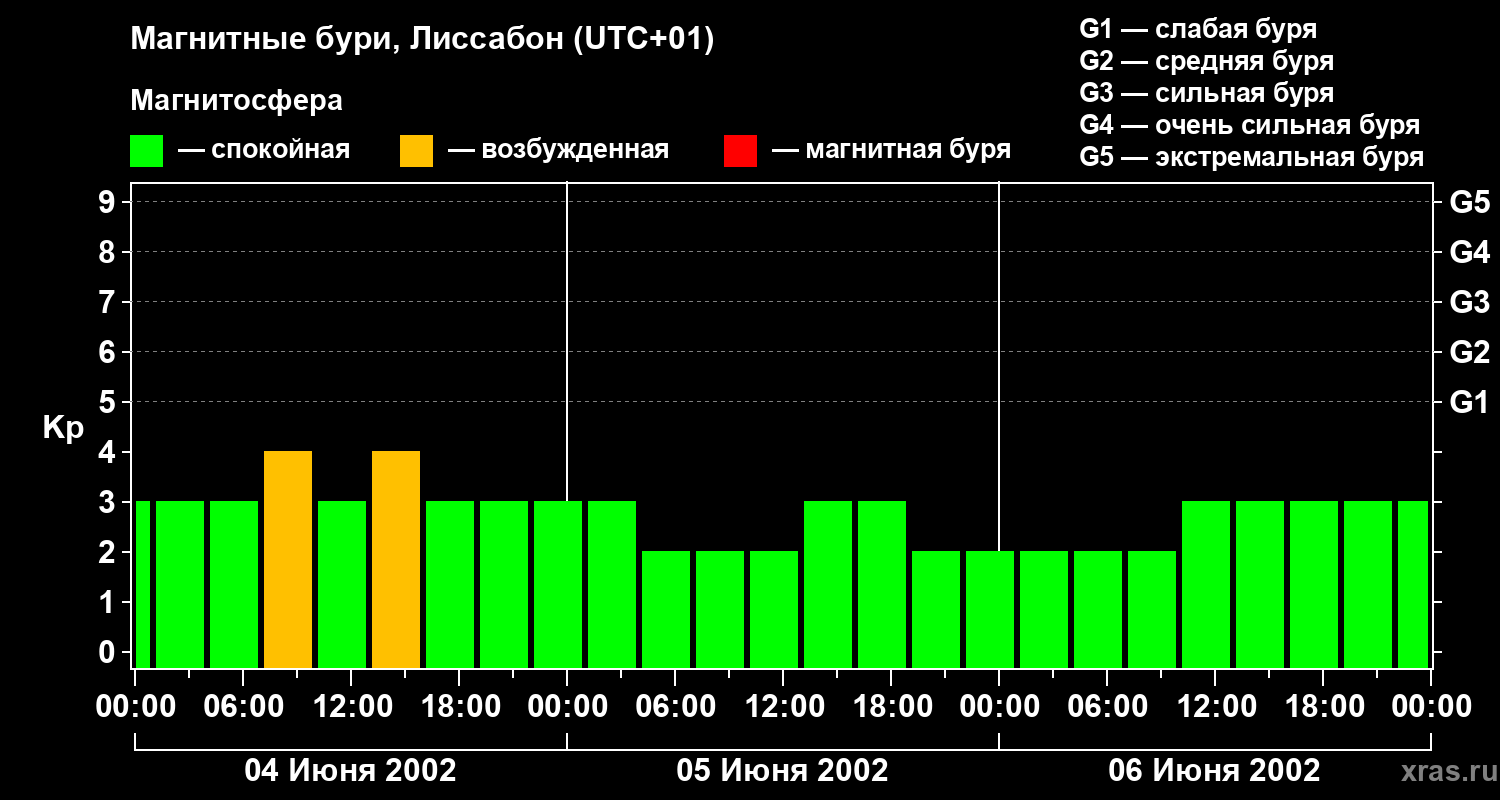 Изменения геомагнитного индекса Kp с 4 по 6 июня 2002 года для средних широт