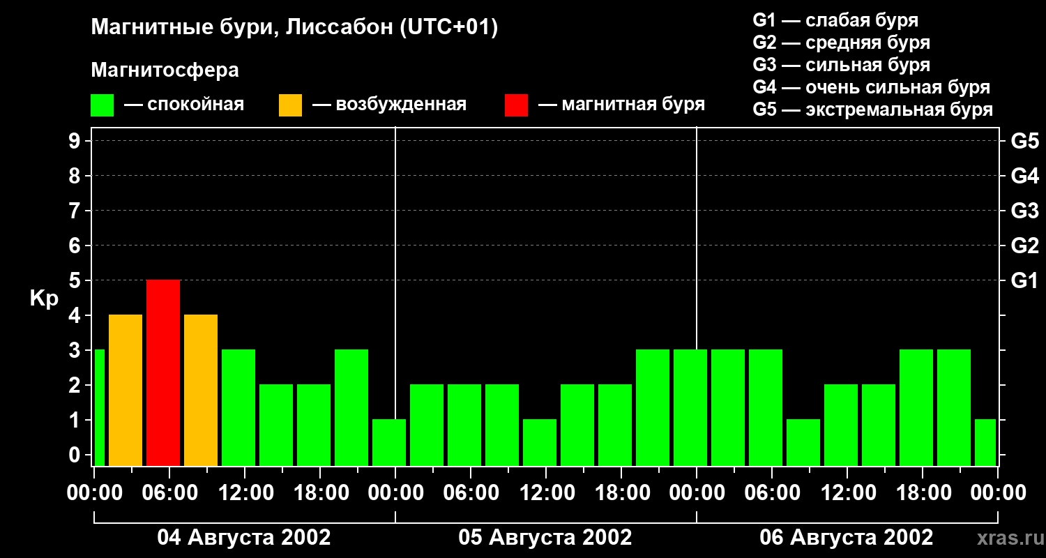 Изменения геомагнитного индекса Kp с 4 по 6 августа 2002 года для средних широт