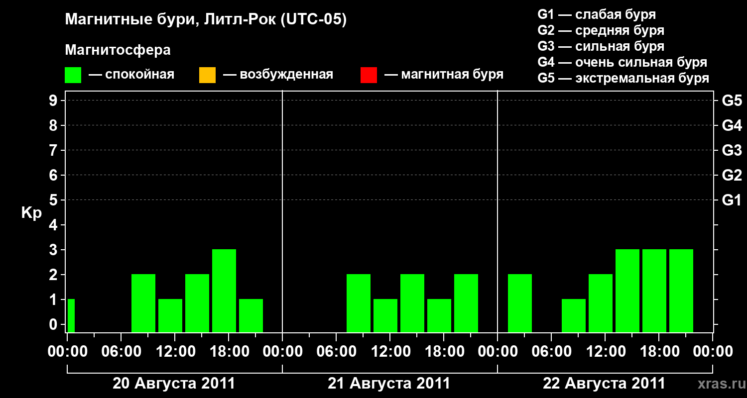 Изменения геомагнитного индекса Kp с 20 по 22 августа 2011 года для средних широт