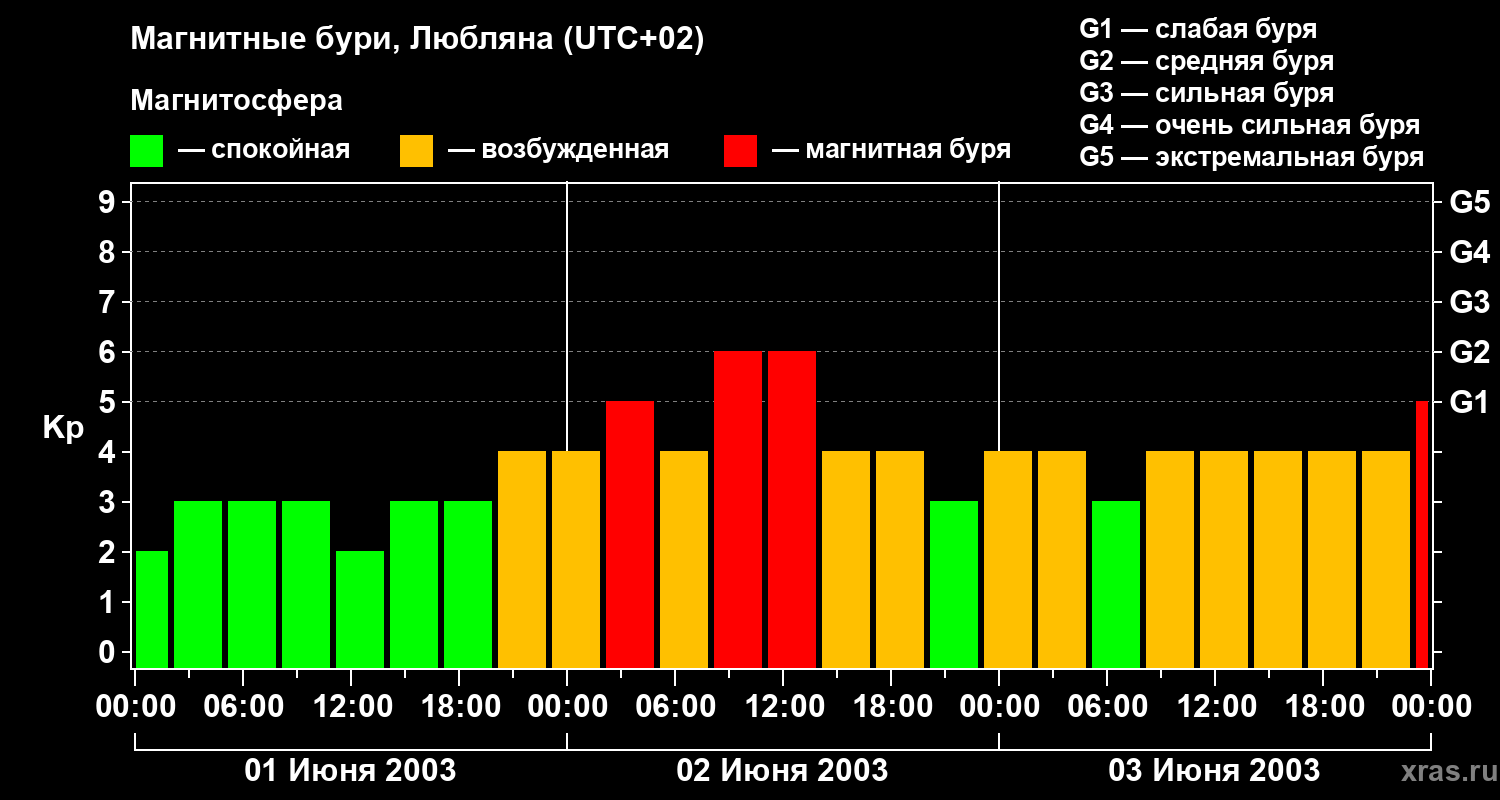 Изменения геомагнитного индекса Kp с 1 по 3 июня 2003 года для средних широт