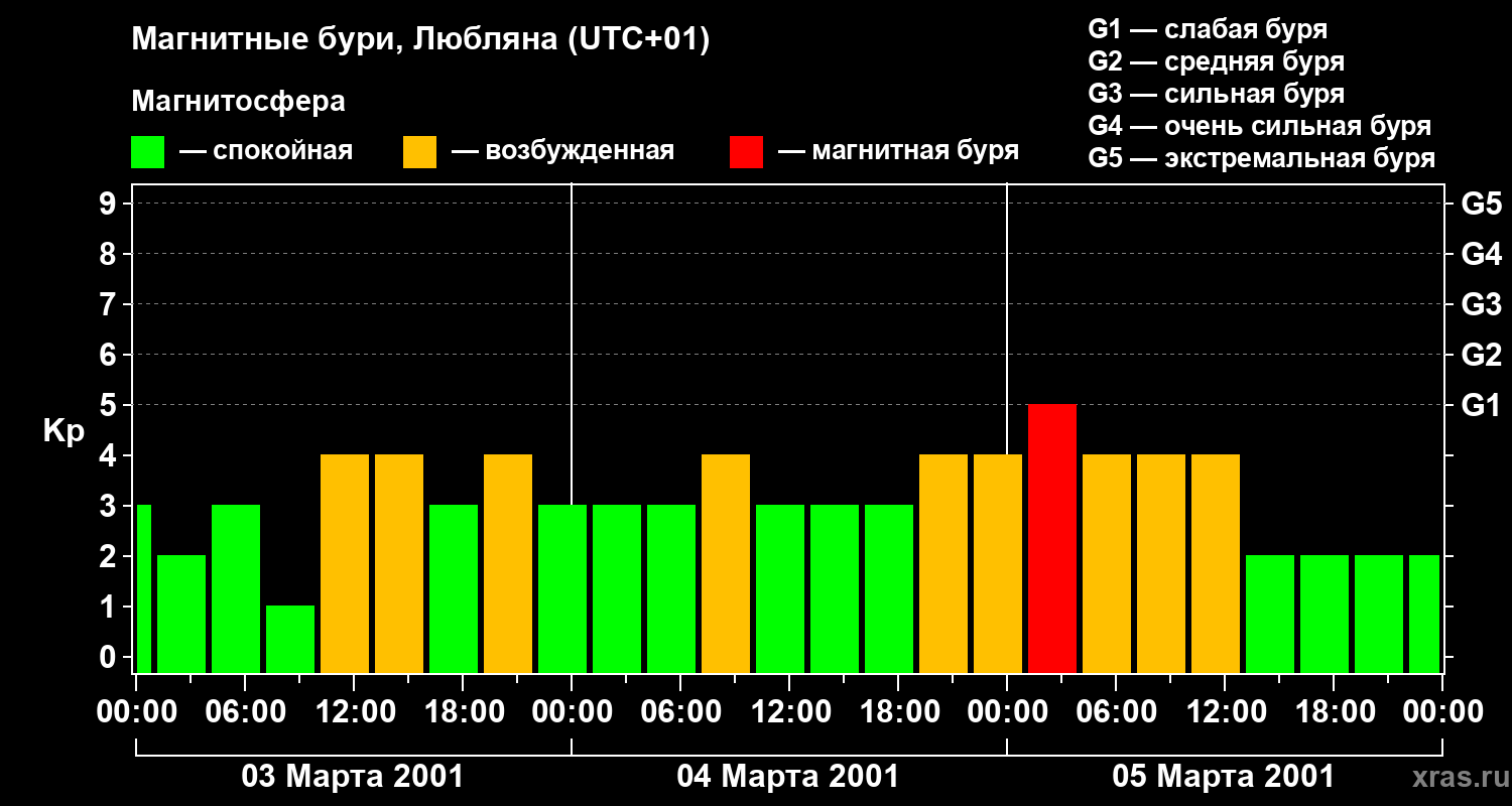Изменения геомагнитного индекса Kp с 3 по 5 марта 2001 года для средних широт