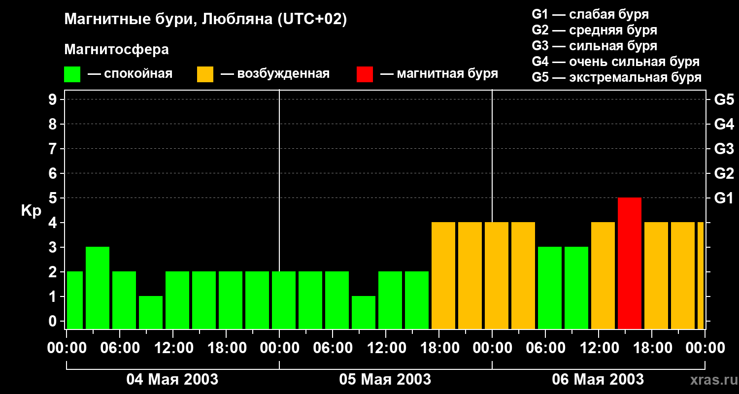 Изменения геомагнитного индекса Kp с 4 по 6 мая 2003 года для средних широт