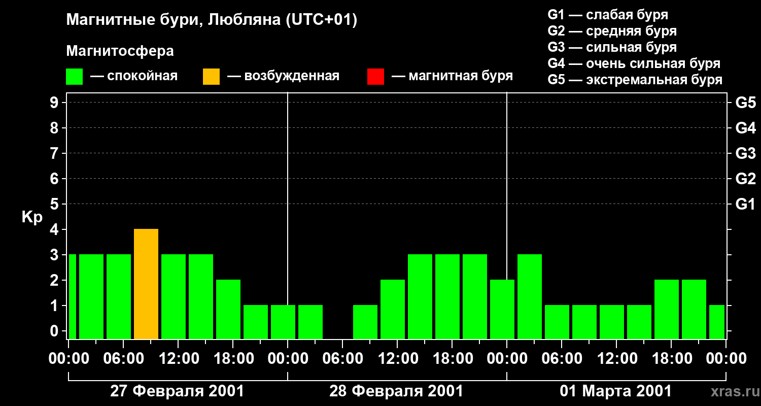 Изменения геомагнитного индекса Kp с 27 февраля по 1 марта 2001 года для средних широт