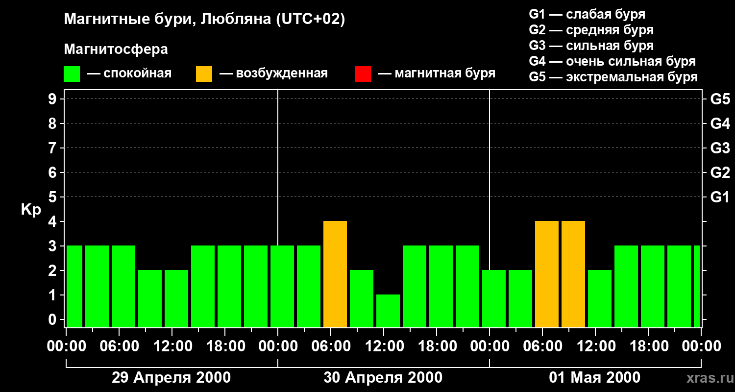 Изменения геомагнитного индекса Kp с 29 апреля по 1 мая 2000 года для средних широт