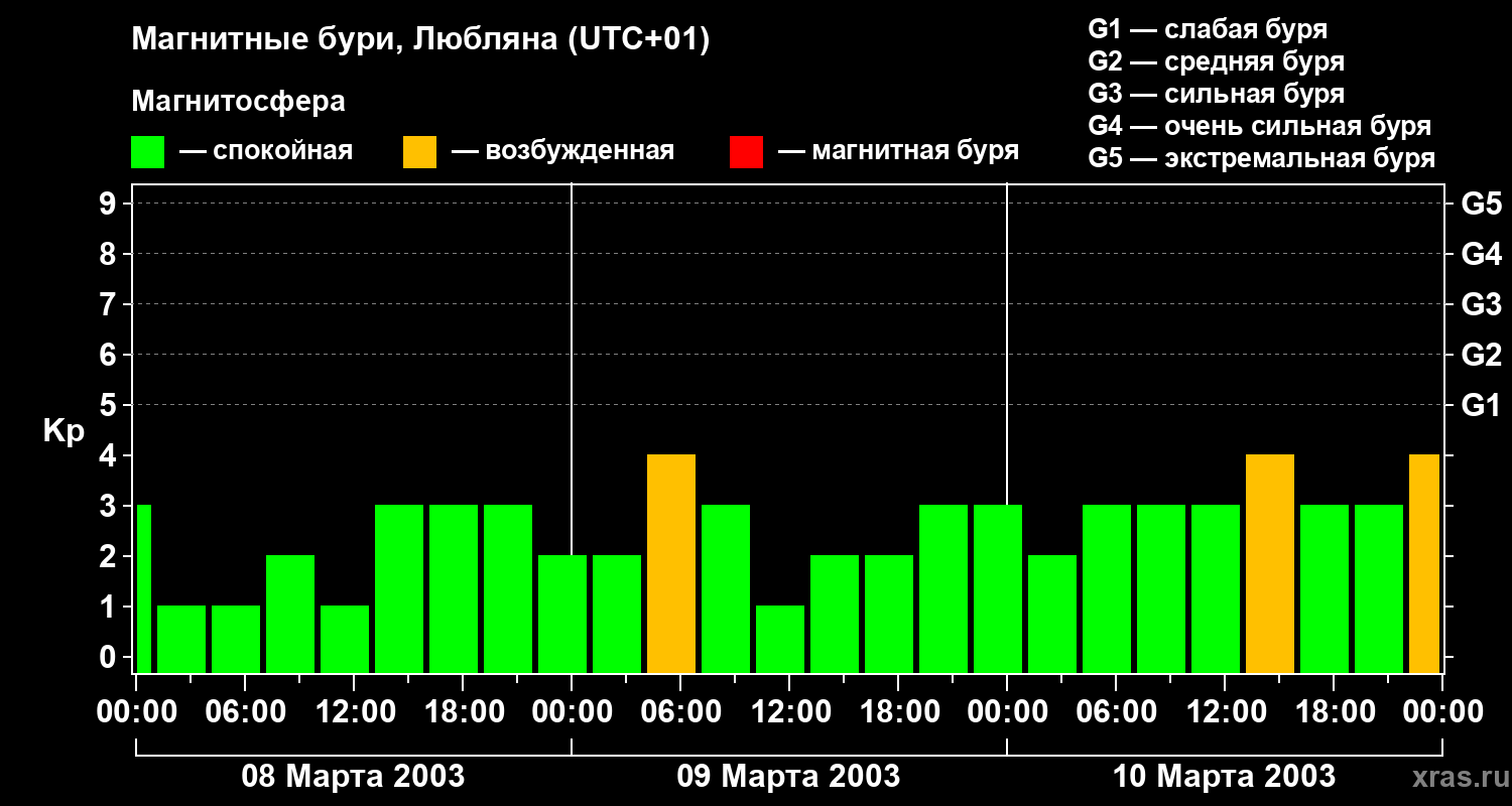 Изменения геомагнитного индекса Kp с 8 по 10 марта 2003 года для средних широт