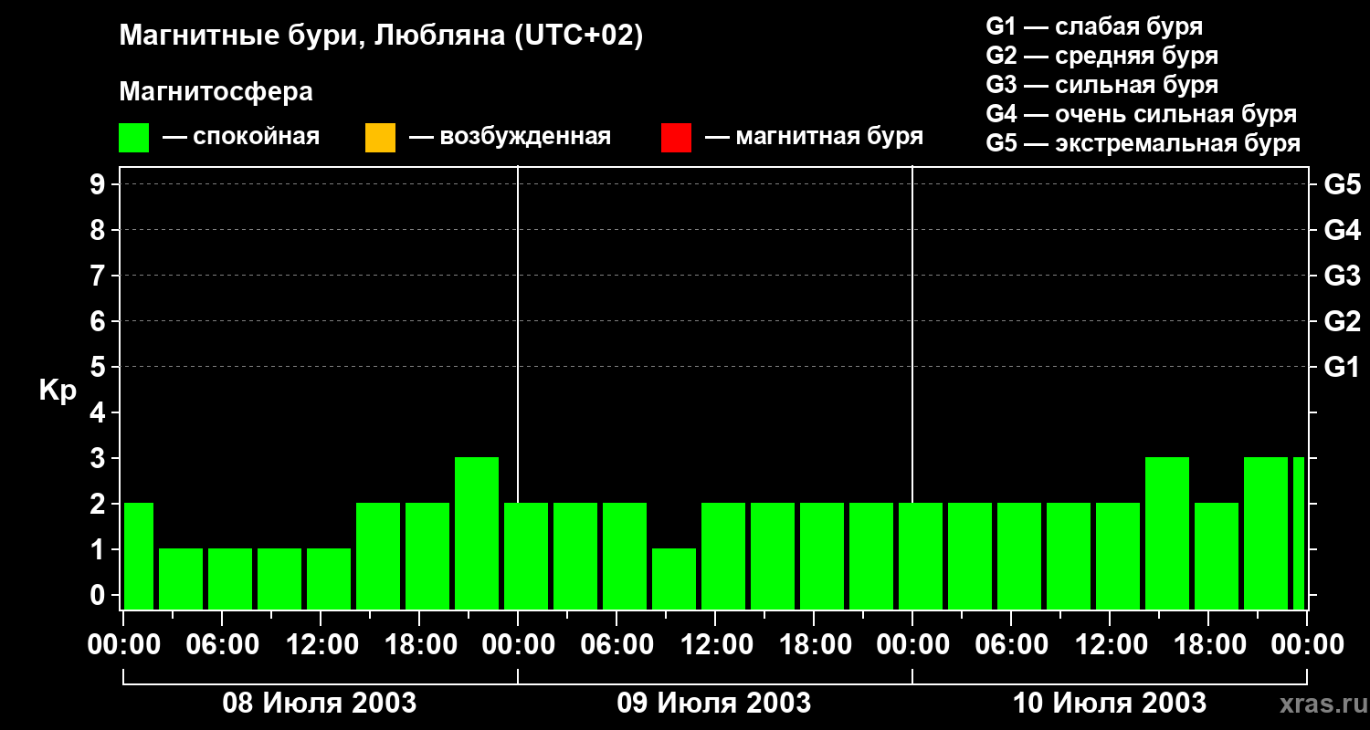 Изменения геомагнитного индекса Kp с 8 по 10 июля 2003 года для средних широт
