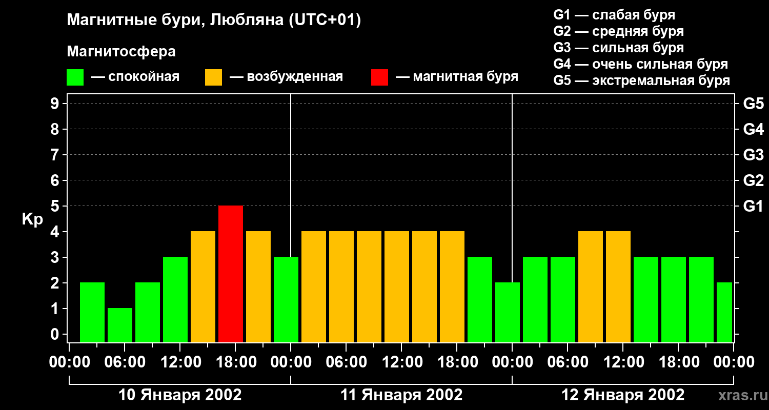 Изменения геомагнитного индекса Kp с 10 по 12 января 2002 года для средних широт