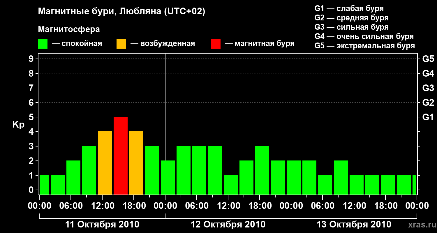 Изменения геомагнитного индекса Kp с 11 по 13 октября 2010 года для средних широт