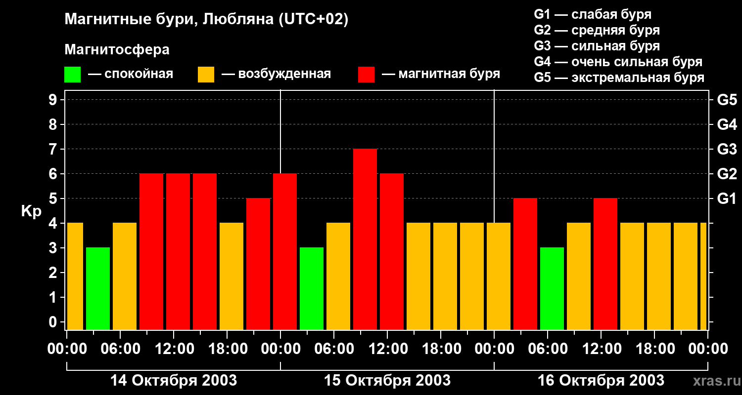 Изменения геомагнитного индекса Kp с 14 по 16 октября 2003 года для средних широт