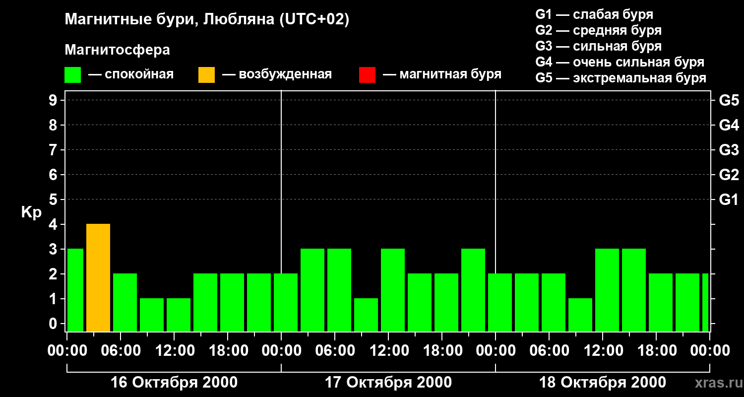 Изменения геомагнитного индекса Kp с 16 по 18 октября 2000 года для средних широт
