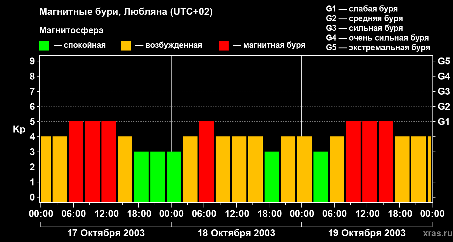 Изменения геомагнитного индекса Kp с 17 по 19 октября 2003 года для средних широт