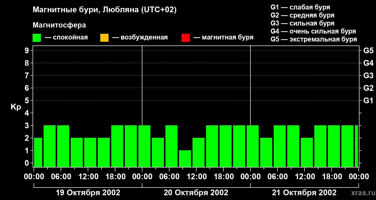 Изменения геомагнитного индекса Kp с 19 по 21 октября 2002 года для средних широт