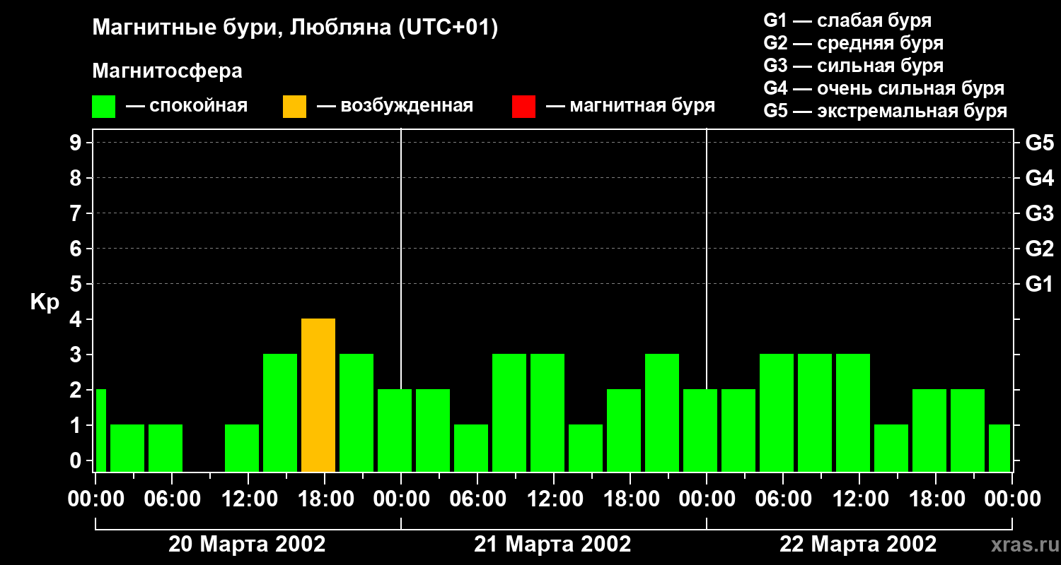 Изменения геомагнитного индекса Kp с 20 по 22 марта 2002 года для средних широт
