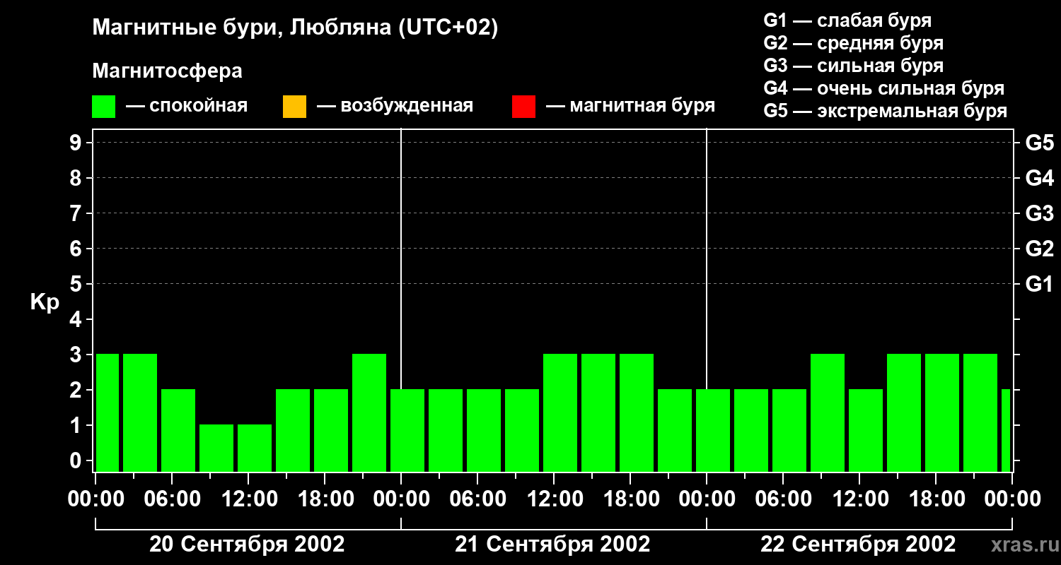 Изменения геомагнитного индекса Kp с 20 по 22 сентября 2002 года для средних широт