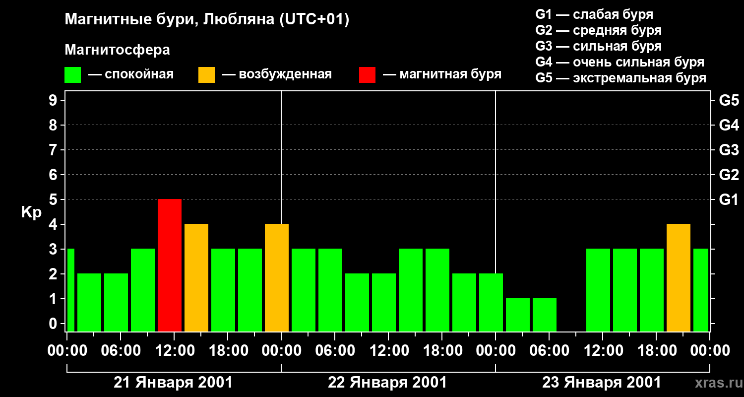 Изменения геомагнитного индекса Kp с 21 по 23 января 2001 года для средних широт