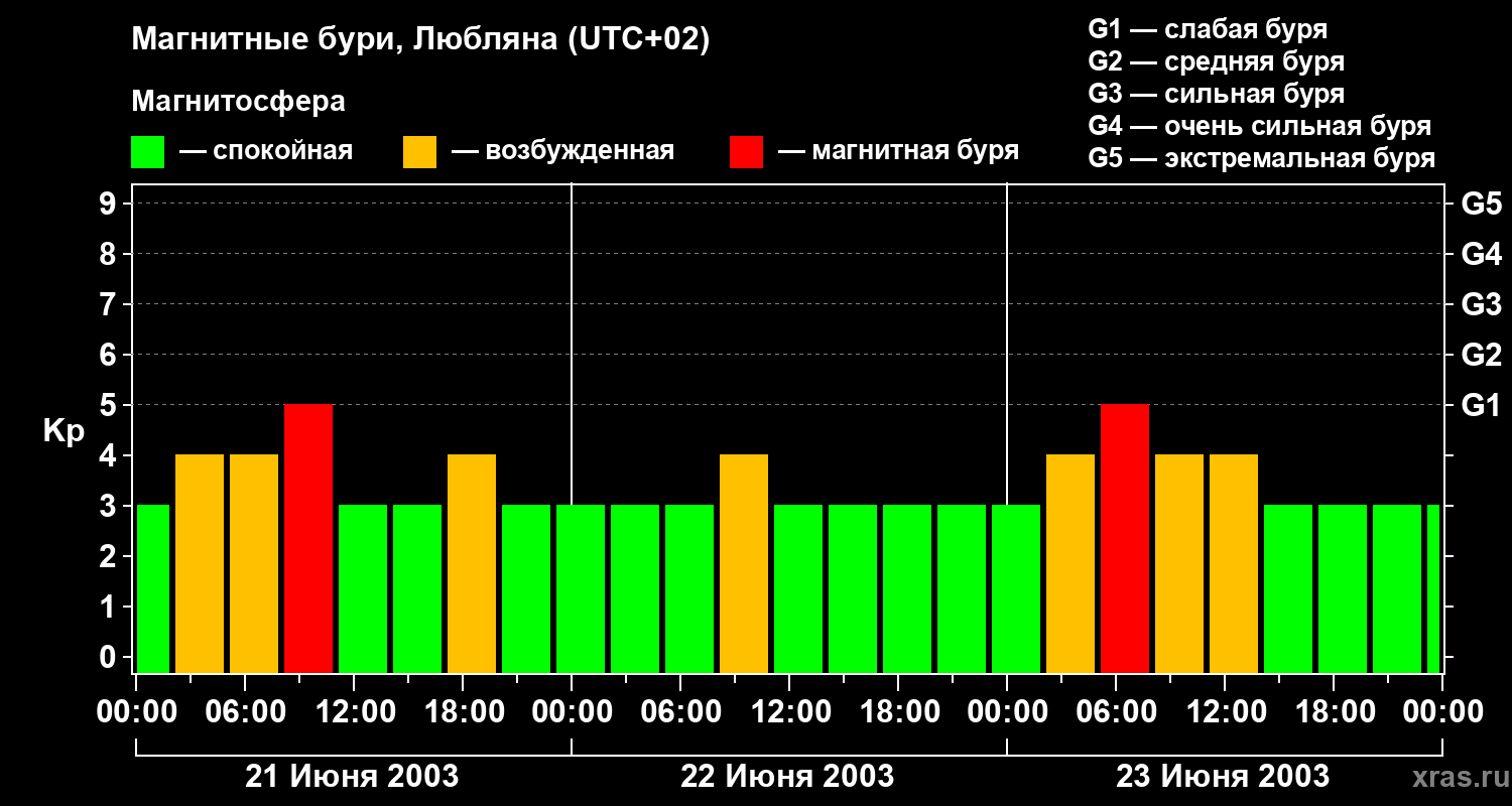 Изменения геомагнитного индекса Kp с 21 по 23 июня 2003 года для средних широт