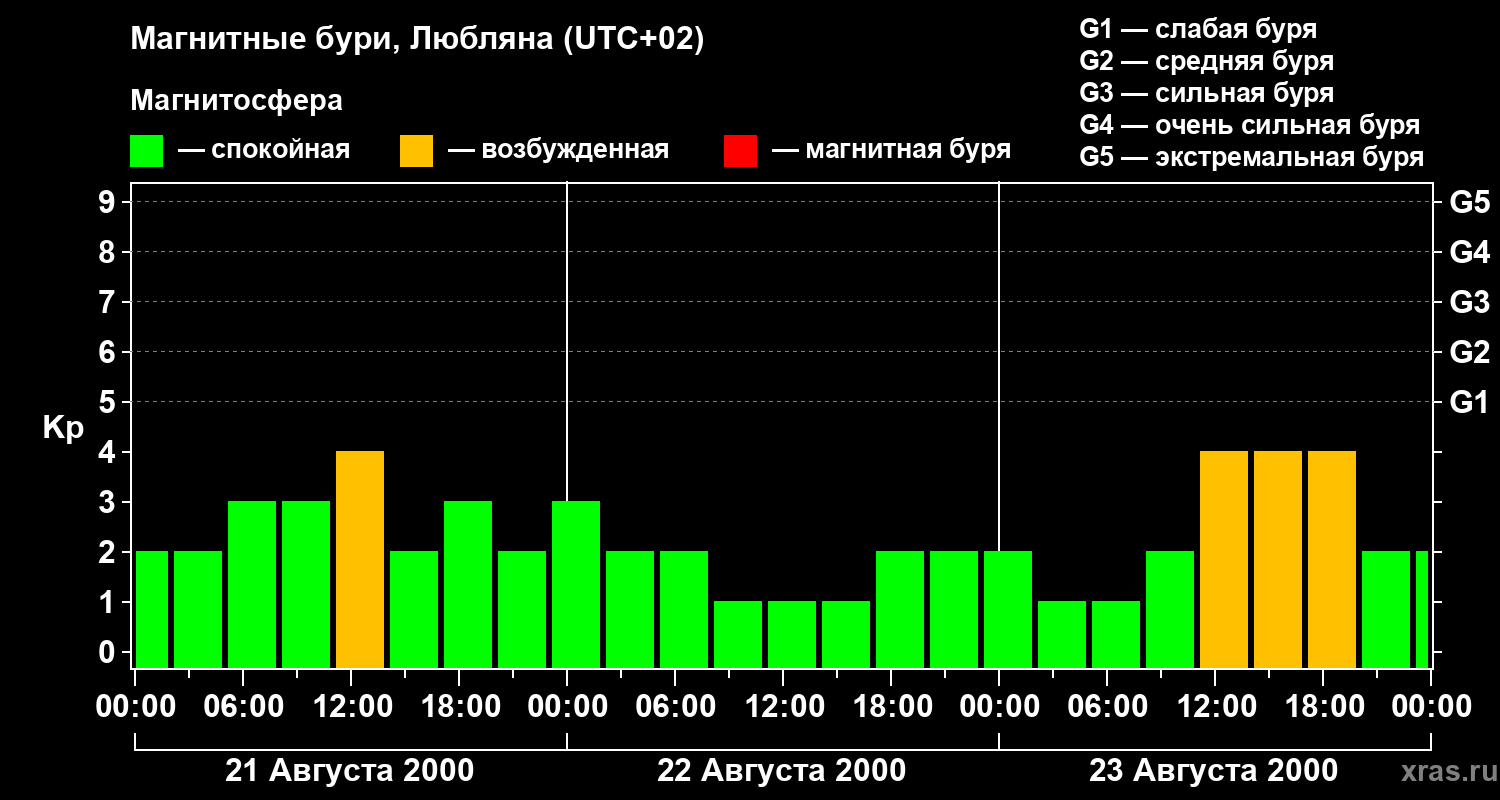 Изменения геомагнитного индекса Kp с 21 по 23 августа 2000 года для средних широт