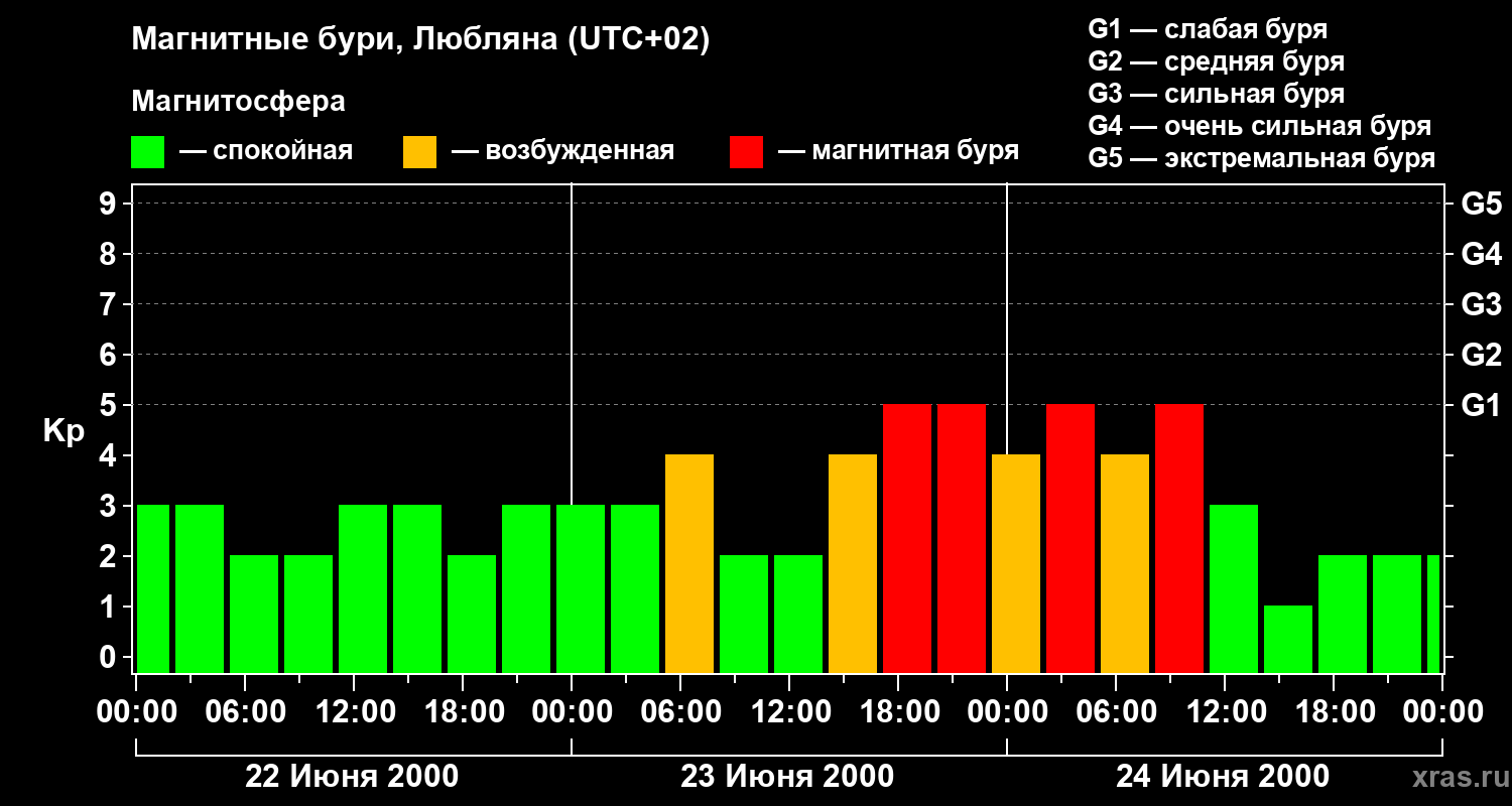 Изменения геомагнитного индекса Kp с 22 по 24 июня 2000 года для средних широт
